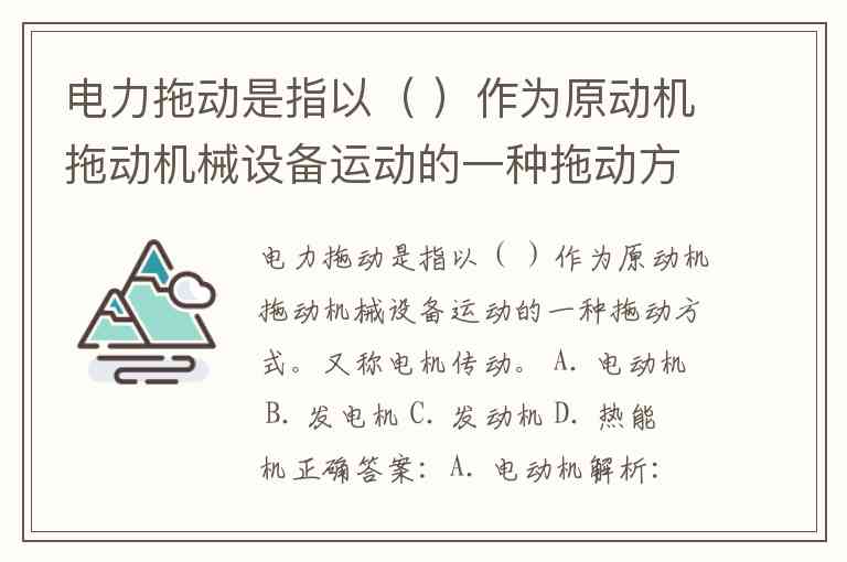 电力拖动是指以( )作为原动机拖动机械设备运动的一种拖动方式。又称电机传动。 A. 电动机 B. 发电机 C. 发动机 D. 热能机