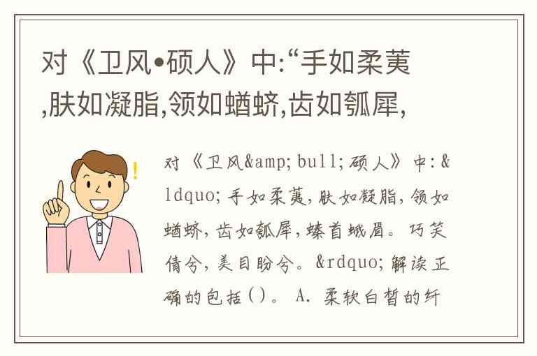 对《卫风•硕人》中:“手如柔荑,肤如凝脂,领如蝤蛴,齿如瓠犀,螓首蛾眉。巧笑倩兮,美目盼兮。”解读正确的包括( )。 A. 柔软白皙的纤手像白茅的嫩芽,润泽细腻的皮肤像凝固的脂肪 B. 修美白晳的脖颈像白而细长的天牛幼虫,匀整洁白的牙齿像洁白而整齐排列的瓠瓜籽儿 C. 丰满的额头像螓的额头,细长弯弯的眉毛像蛾的触角 D. 微微一笑嘴角上翘,黑白分明的眼睛顾盼生辉