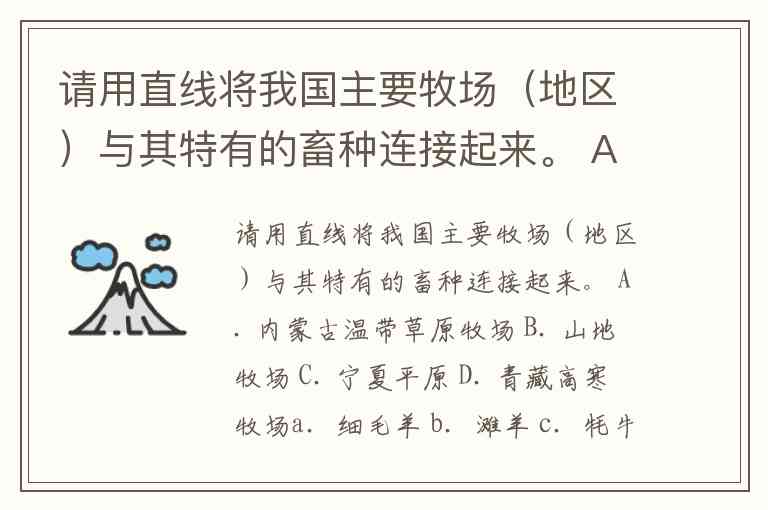 请用直线将我国主要牧场(地区)与其特有的畜种连接起来。 A. 内蒙古温带草原牧场 B. 山地牧场 C. 宁夏平原 D. 青藏高寒牧场a.细毛羊 b.滩羊 c.牦牛、藏绵羊 d.三河牛、三河马