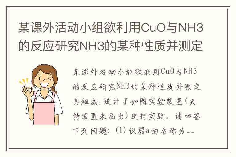 某课外活动小组欲利用CuO与NH3的反应研究NH3的某种性质并测定其组成,设计了如图实验装置(夹持装置未画出)进行实验。请回答下列问题: (1)仪器a的名称为__;仪器b中可选择的试剂为__。(2)实验室中,利用装置A,还可制取的无色气体是__(填字母)。 A. Cl2 B. O2 C. CO2 D. NO2