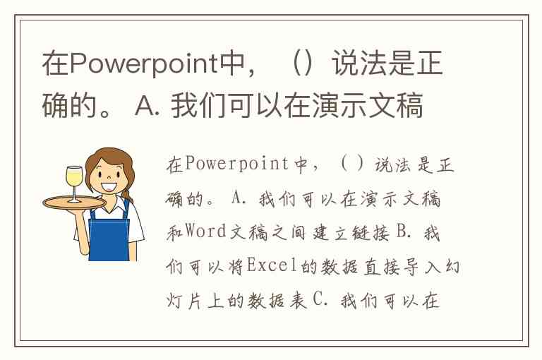 在Powerpoint中,()说法是正确的。 A. 我们可以在演示文稿和Word文稿之间建立链接 B. 我们可以将Excel的数据直接导入幻灯片上的数据表 C. 我们可以在幻灯片浏览视图中对演示文稿进行整体修改 D. 演示文稿不能转换成Web页