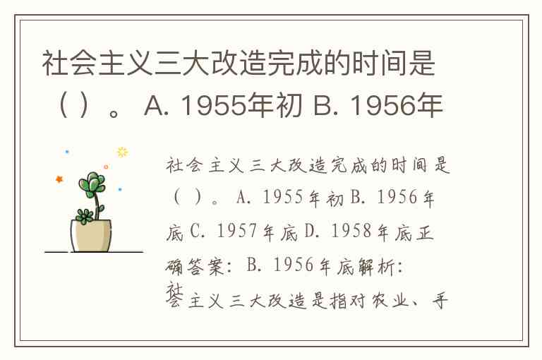 社会主义三大改造完成的时间是( )。 A. 1955年初 B. 1956年底 C. 1957年底 D. 1958年底