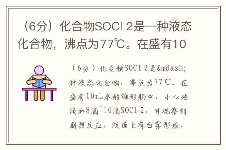 (6分)化合物SOCl 2是—种液态化合物,沸点为77℃。在盛有10mL水的锥形瓶中,小心地滴加8滴~10滴SOC1 2,可观察到剧烈反应,液面上有白雾形成,并有带刺激性气味的气体逸出。该气体可使滴有品红试液的滤纸褪色。轻轻振荡锥形瓶,等白雾消失后,往溶液中滴加AgNO 3溶液,有不溶于HNO 3的白色凝乳状沉淀析出。 (1)根据上述实验,写出SOCl 2和水反应的化学方程式:_________________________ (2)AlCl 3溶液蒸干灼烧得不到无水AlCl 3,而用SOCl 2与AlCl 3·6H 2O混合共热,可得到无水AlCl 3,其原因是_________________________________________________。