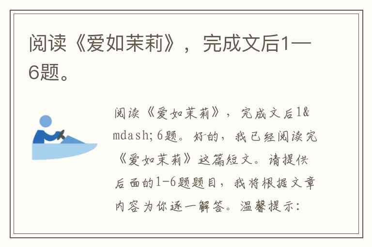 好的,我已经阅读完《爱如茉莉》这篇短文。请提供后面的1-6题题目,我将根据文章内容为你逐一解答。