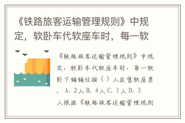 《铁路旅客运输管理规则》中规定,软卧车代软座车时,每一软卧下铺铺位按()人发售软座票。 A. 2人 B. 4人 C. 1人 D. 3人
