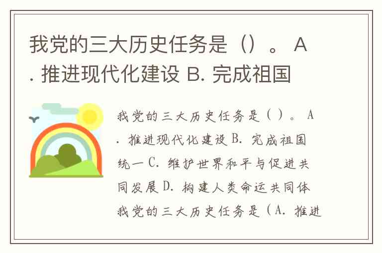我党的三大历史任务是()。 A. 推进现代化建设 B. 完成祖国统一 C. 维护世界和平与促进共同发展 D. 构建人类命运共同体