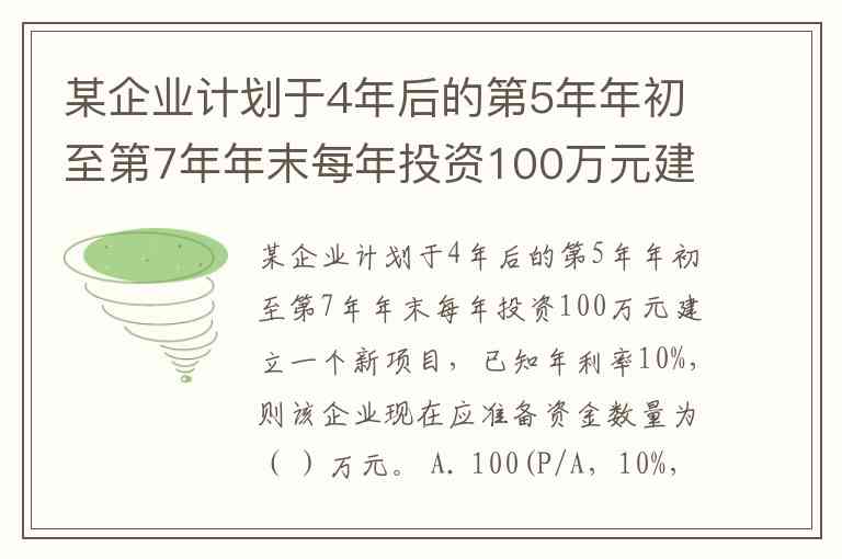 某企业计划于4年后的第5年年初至第7年年末每年投资100万元建立一个新项目,已知年利率10%,则该企业现在应准备资金数量为( )万元。 A. 100(P/A,10%,4)(P/F,10%,3) B. 100(A/P,10%,3)(A/F,10%,4) C. 100(P/A,10%,3)(F/P,10%,4) D. 100(A/P,10%,3)(F/A,10%,4)