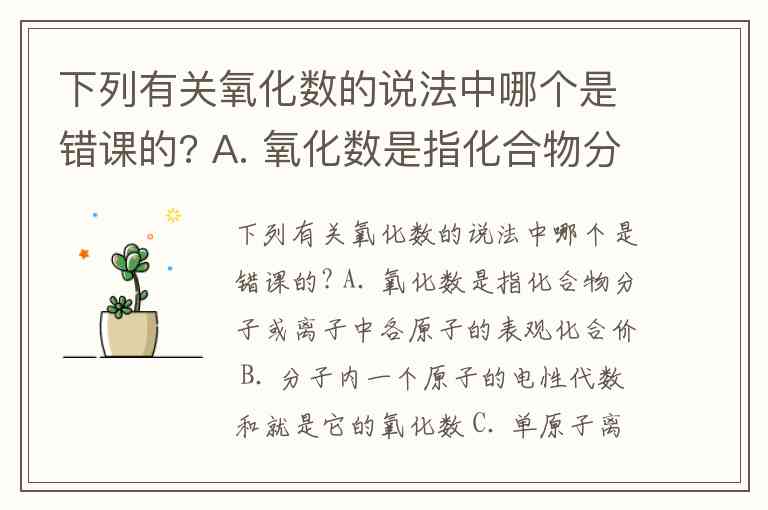 不过具体到本题,题干如果是选一个错误答案,并且 B 也是错误的,那么必须看哪个是最常被当作答案的。在常见的选择题题库里,氧化数一节最经典的错误说法是 “氧化数等于原子实际电荷”(即 B),所以通常选 B。