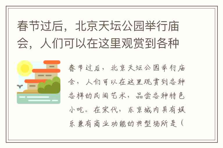 春节过后,北京天坛公园举行庙会,人们可以在这里观赏到各种各样的民间艺术,品尝各种特色小吃。在宋代,东京城内具有娱乐兼有商业功能的典型场所是() A. 狂欢节 B. 瓦子 C. 庙会 D.