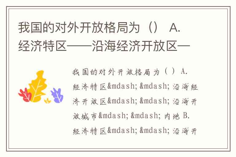 我国的对外开放格局为() A. 经济特区——沿海经济开放区——沿海开放城市——内地 B. 经济特区——沿海开放城市——沿海经济开放区——内地 C. 沿海开放城市——经济特区——沿海经济开放区——内地 D. 沿海开放城市——沿海经济开放区——经济特区——内地