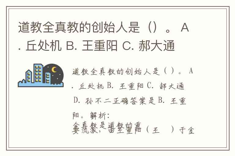 道教全真教的创始人是()。 A. 丘处机 B. 王重阳 C. 郝大通 D. 孙不二
