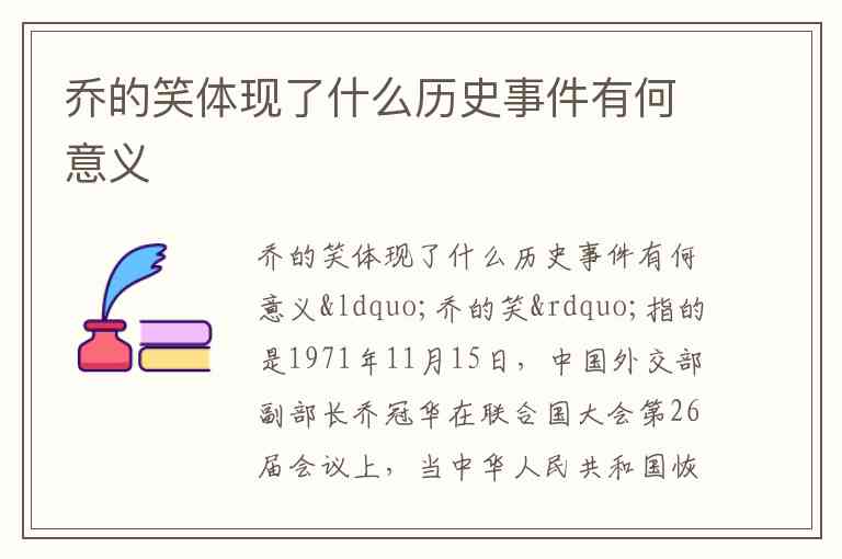 “乔的笑”指的是1971年11月15日,中国外交部副部长乔冠华在联合国大会第26届会议上,当中华人民共和国恢复在联合国的一切合法权利时,被记者抓拍到的开怀大笑的经典场景。这张照片后来获得了美国普利策新闻奖,成为新中国外交史上标志性的瞬间。