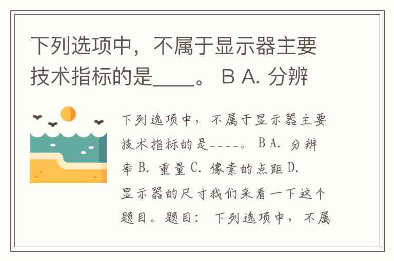 下列选项中,不属于显示器主要技术指标的是____。 B A. 分辨率 B. 重量 C. 像素的点距 D. 显示器的尺寸