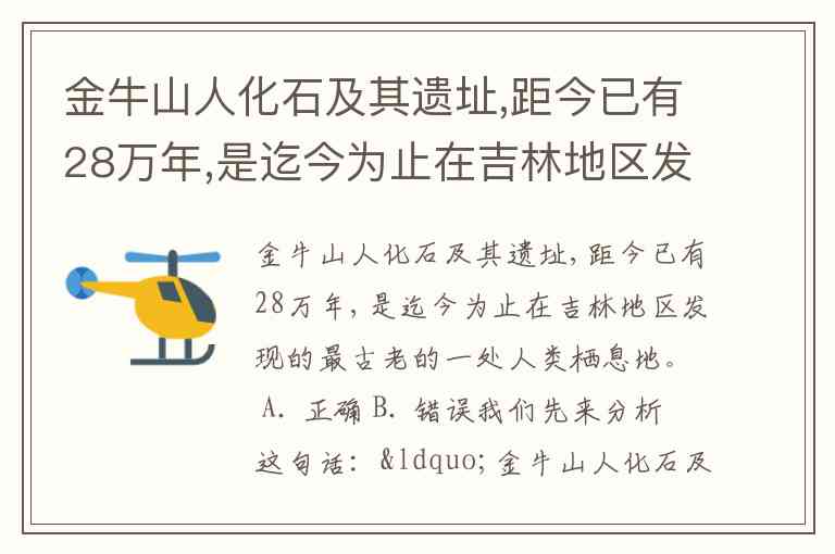金牛山人化石及其遗址,距今已有28万年,是迄今为止在吉林地区发现的最古老的一处人类栖息地。 A. 正确 B. 错误