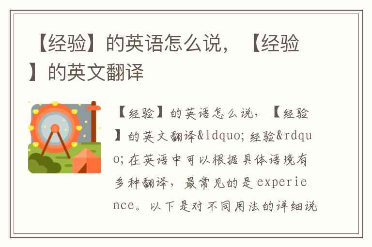 “经验”在英语中可以根据具体语境有多种翻译,最常见的是 experience。以下是对不同用法的详细说明: