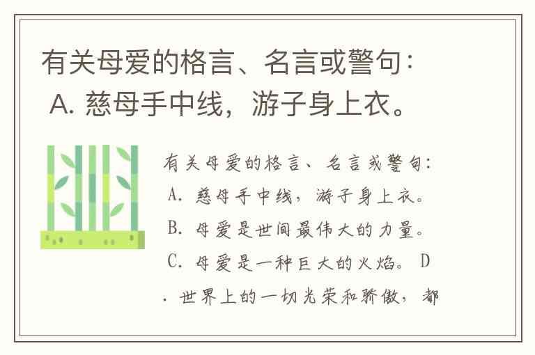 有关母爱的格言、名言或警句: A. 慈母手中线,游子身上衣。 B. 母爱是世间最伟大的力量。 C. 母爱是一种巨大的火焰。 D. 世界上的一切光荣和骄傲,都来自母亲。