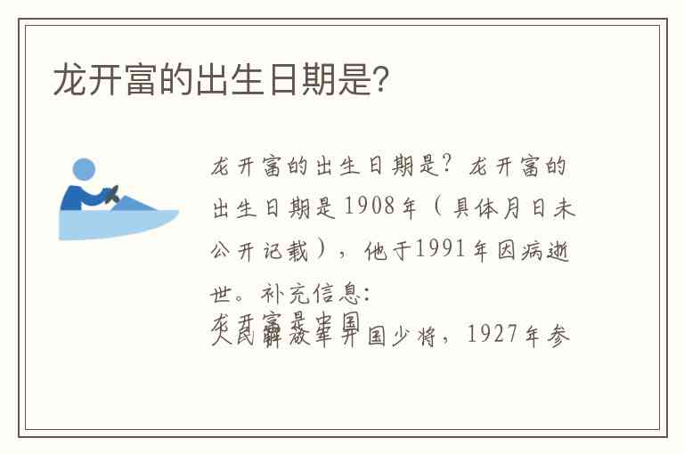 龙开富的出生日期是 1908年(具体月日未公开记载),他于1991年因病逝世。