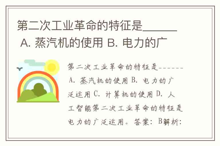 第二次工业革命的特征是______ A. 蒸汽机的使用 B. 电力的广泛运用 C. 计算机的使用 D. 人工智能