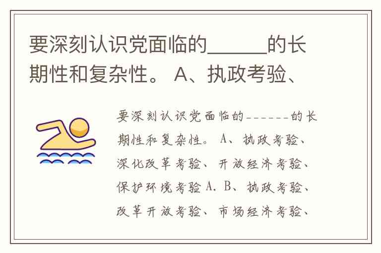 要深刻认识党面临的______的长期性和复杂性。 A、执政考验、深化改革考验、开放经济考验、保护环境考验 A. B、执政考验、改革开放考验、市场经济考验、外部环境考验 B. C、领导考验、深化改革考验、开放经济考验、保护环境考验 C. D、领导考验、改革开放考验、市场经济考验、外部环境考验 B
