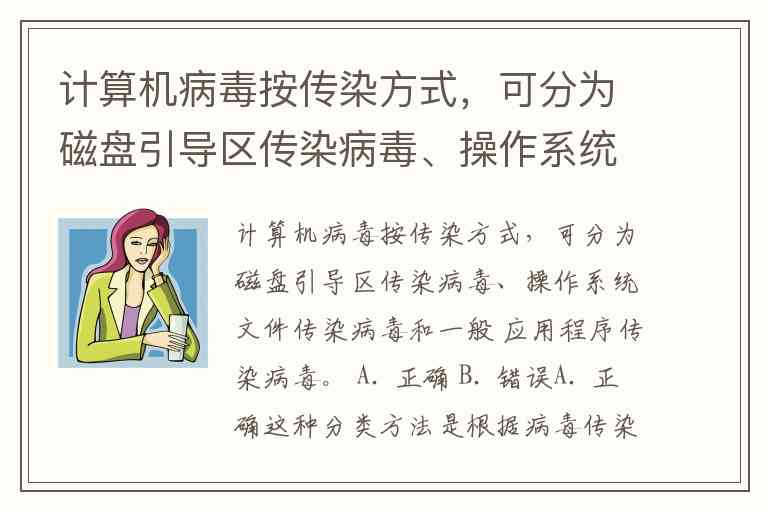 计算机病毒按传染方式,可分为磁盘引导区传染病毒、操作系统文件传染病毒和一般 应用程序传染病毒。 A. 正确 B. 错误