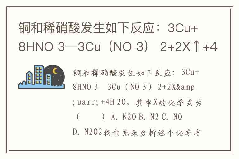 铜和稀硝酸发生如下反应:3Cu+8HNO 3═3Cu(NO 3) 2+2X↑+4H 2O,其中X的化学式为( ) A. N2O B. N2 C. NO D. N2O2