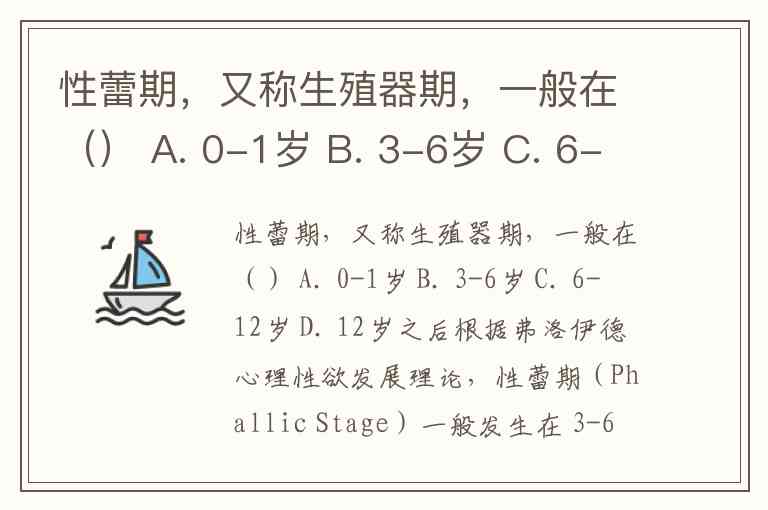 性蕾期,又称生殖器期,一般在() A. 0-1岁 B. 3-6岁 C. 6-12岁 D. 12岁之后