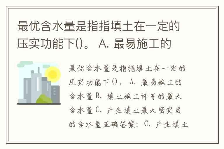 最优含水量是指指填土在一定的压实功能下()。 A. 最易施工的含水量 B. 填土施工许可的最大含水量 C. 产生填土最大密实度的含水量