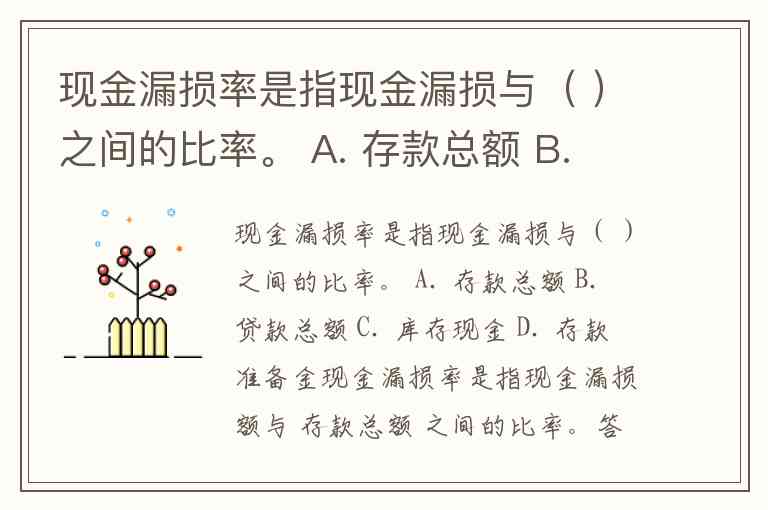 现金漏损率是指现金漏损与( )之间的比率。 A. 存款总额 B. 贷款总额 C. 库存现金 D. 存款准备金