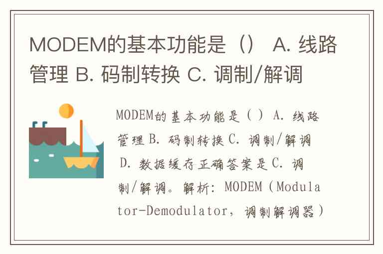 MODEM的基本功能是() A. 线路管理 B. 码制转换 C. 调制/解调 D. 数据缓存