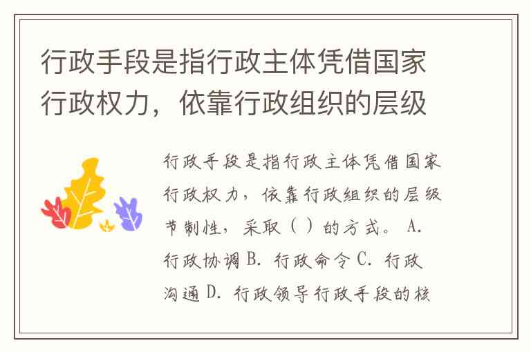 行政手段是指行政主体凭借国家行政权力,依靠行政组织的层级节制性,采取()的方式。 A. 行政协调 B. 行政命令 C. 行政沟通 D. 行政领导