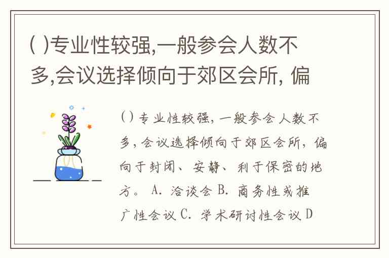 ( )专业性较强,一般参会人数不多,会议选择倾向于郊区会所, 偏向于封闭、安静、利于保密的地方。 A. 洽谈会 B. 商务性或推广性会议 C. 学术研讨性会议 D. 政治性会议