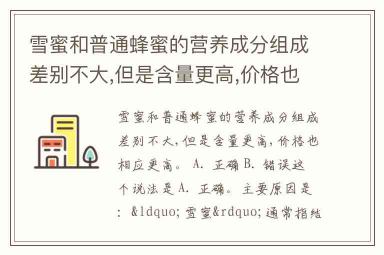雪蜜和普通蜂蜜的营养成分组成差别不大,但是含量更高,价格也相应更高。 A. 正确 B. 错误