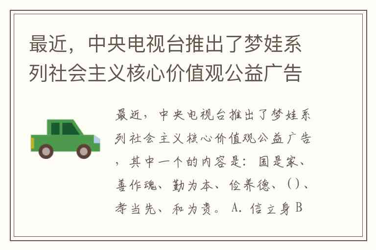 最近,中央电视台推出了梦娃系列社会主义核心价值观公益广告,其中一个的内容是:国是家、善作魂、勤为本、俭养德、( )、孝当先、和为贵。 A. 信立身 B. 诚立身 C. 仁立身