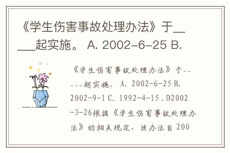 《学生伤害事故处理办法》于_____起实施。 A. 2002-6-25 B. 2002-9-1 C. 1992-4-15 .D2002-3-26