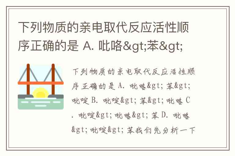 下列物质的亲电取代反应活性顺序正确的是 A. 吡咯>苯>吡啶 B. 吡啶>苯>吡咯 C. 吡啶>吡咯>苯 D. 吡咯>吡啶>苯