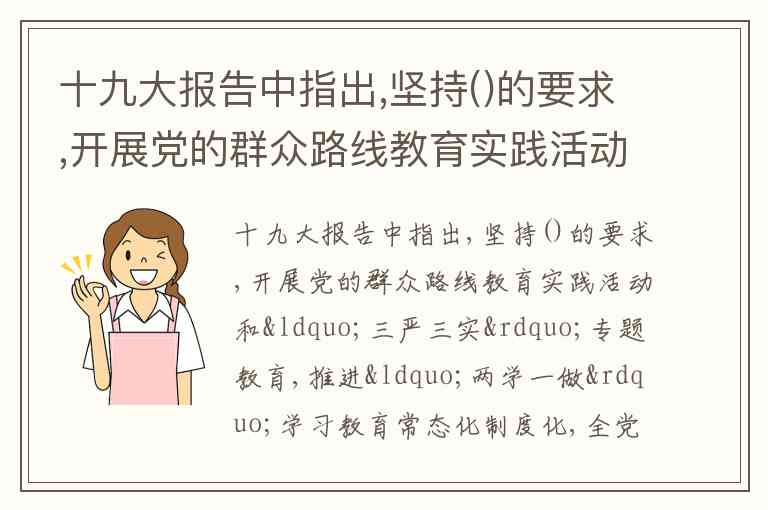 十九大报告中指出,坚持()的要求,开展党的群众路线教育实践活动和“三严三实”专题教育,推进“两学一做”学习教育常态化制度化,全党理想信念更加坚定、党性更加坚强。 A. 照镜子 B. 正衣冠 C. 洗洗澡 D. 治治病
