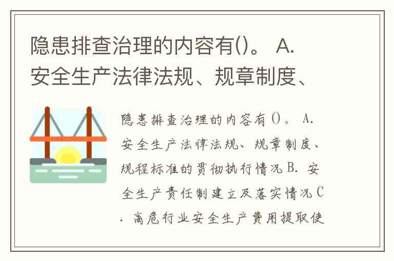 隐患排查治理的内容包括:A. 安全生产法律法规、规章制度、规程标准的贯彻执行情况B. 安全生产责任制建立及落实情况C. 高危行业安全生产费用提取使用D. 安全生产风险抵押金交纳等经济政策的执行情况