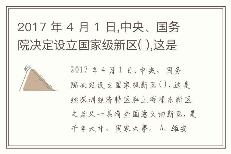 2017 年 4 月 1 日,中央、国务院决定设立国家级新区( ),这是继深圳经济特区和上海浦东新区之后又一具有全国意义的新区,是千年大计、国家大事。 A. 雄安新区 B. 安新新区 C. 廊坊新区 D. 雄县新区