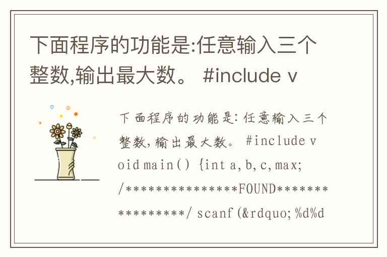 下面程序的功能是:任意输入三个整数,输出最大数。 #include void main( ) {int a,b,c,max; /***************FOUND****************/ scanf(”%d%d%d”,a,b,c); 1 max=a; if(b>a) max=b; 2 printf(”max=%d\n”,max); }
