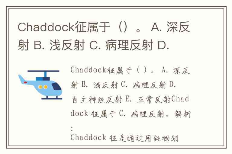 Chaddock征属于()。 A. 深反射 B. 浅反射 C. 病理反射 D. 自主神经反射 E. 正常反射