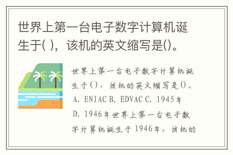 世界上第一台电子数字计算机诞生于( ),该机的英文缩写是()。 A. ENIAC B. EDVAC C. 1945年 D. 1946年