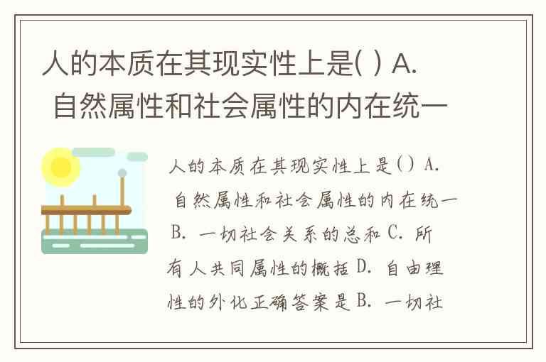 人的本质在其现实性上是( ) A. 自然属性和社会属性的内在统一 B. 一切社会关系的总和 C. 所有人共同属性的概括 D. 自由理性的外化