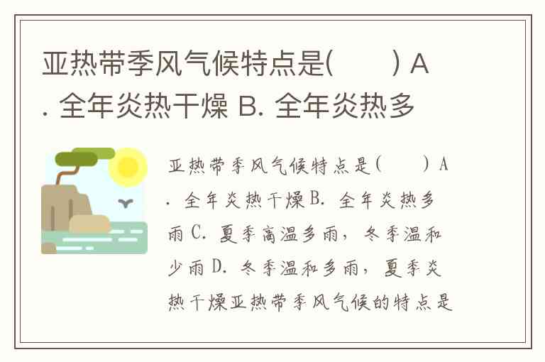 亚热带季风气候特点是( ) A. 全年炎热干燥 B. 全年炎热多雨 C. 夏季高温多雨,冬季温和少雨 D. 冬季温和多雨,夏季炎热干燥