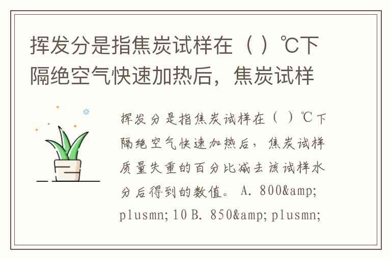 挥发分是指焦炭试样在( )℃下隔绝空气快速加热后,焦炭试样质量失重的百分比减去该试样水分后得到的数值。 A. 800±10 B. 850±10 C. 900±10 D. 950±10