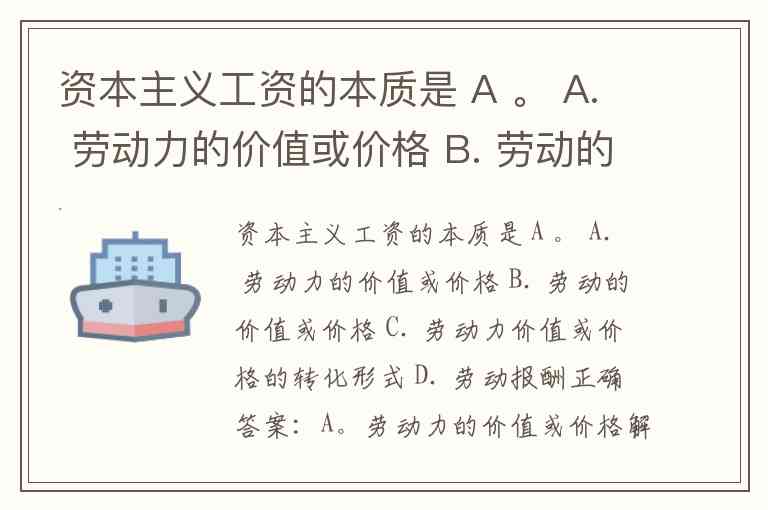 资本主义工资的本质是 A 。 A. 劳动力的价值或价格 B. 劳动的价值或价格 C. 劳动力价值或价格的转化形式 D. 劳动报酬