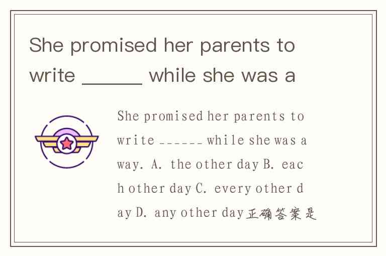 She promised her parents to write ______ while she was away. A. the other day B. each other day C. every other day D. any other day