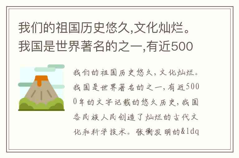 材料开头就说“祖国历史悠久,文化灿烂”,并列举了 5000 多年文字记载的历史,这体现了源远流长的特征,①正确。