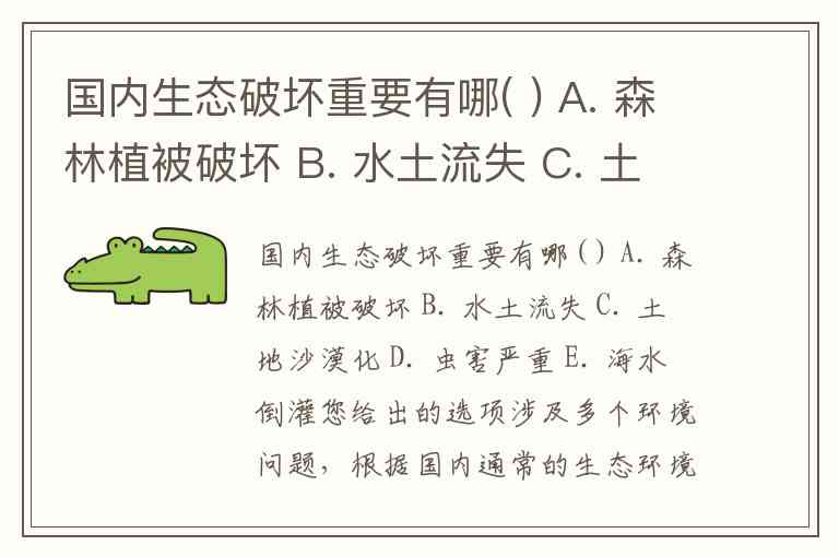 国内生态破坏重要有哪( ) A. 森林植被破坏 B. 水土流失 C. 土地沙漠化 D. 虫害严重 E. 海水倒灌