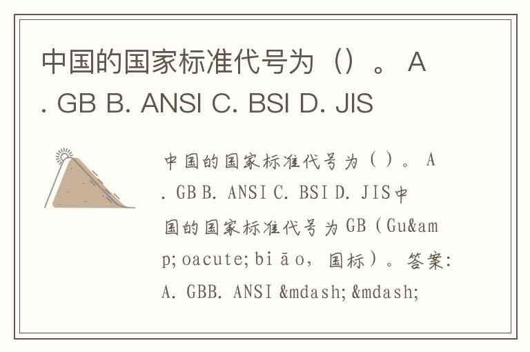中国的国家标准代号为()。 A. GB B. ANSI C. BSI D. JIS