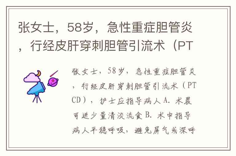 张女士,58岁,急性重症胆管炎,行经皮肝穿刺胆管引流术(PTCD),护士应指导病人 A. 术晨可进少量清淡流食 B. 术中指导病人平稳呼吸,避免屏气或深呼吸 C. 穿刺时可选择任意舒适体位 D. 引流后应活动,以利于胆汁引流